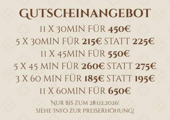 Bis zum 28.02.2026 können Sie bei uns dieses Gutschein-Angebot direkt vor Ort erwerben. Diese sind bis zu 3 Jahre gültig und flexibel einlösbar, perfekt zum Verschenken oder selbst Genießen.